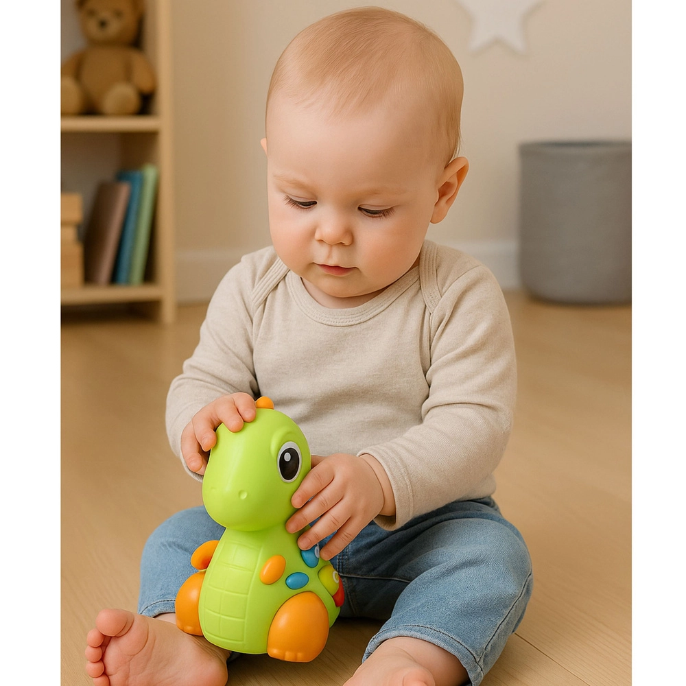 Der interaktive Dinosaurier begeistert Kinder auf den ersten Blick: Beim Drücken der farbigen Tasten leuchtet er, spielt Melodien ab und gibt fröhliche Geräusche von sich. Ein sanftes Tippen auf die Nase startet Musik und Bewegung – so wird das Verständnis des Zusammenhangs zwischen Berührung und Reaktion des Spielzeugs gefördert – eine großartige Grundlage für spielerisches Lernen.