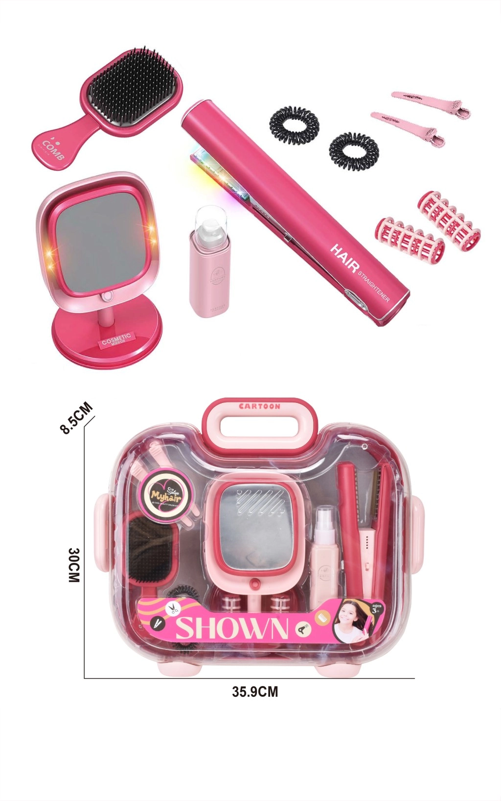 • Lieferumfang: Kinder-Haarglätteisen (Licht und Sound), LED-Tischspiegel mit Standfuß, Haarbürste, 2× Haarspange (verschiedene Typen), 2× Lockenwickler, 2× Haargummi, Tragkoffer