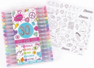 Ein reichhaltiges Set mit 30 Gelstiften in sechs verschiedenen Stilen – metallisch, pastell, neon, regenbogenfarben und glitzernd. Jeder Stift bietet kreative Möglichkeiten zum Zeichnen, Schreiben und Dekorieren.