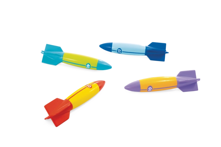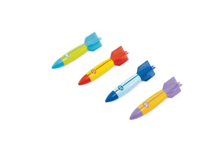 Jedes Torpedo hat auffällige Farben und Zahlenmarkierungen (10/20/30/40) für einfaches Unterscheiden und Punktwertung. Stabilisierungsflügel erleichtern den Griff und die Richtungssteuerung, sodass Kinder unter Wasser längere und präzisere Würfe erzielen – ideal für Wettbewerbe mit Freunden im Pool oder Freibad.