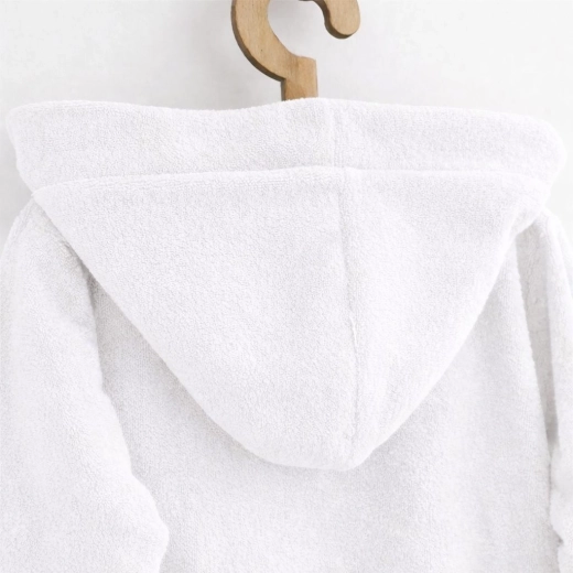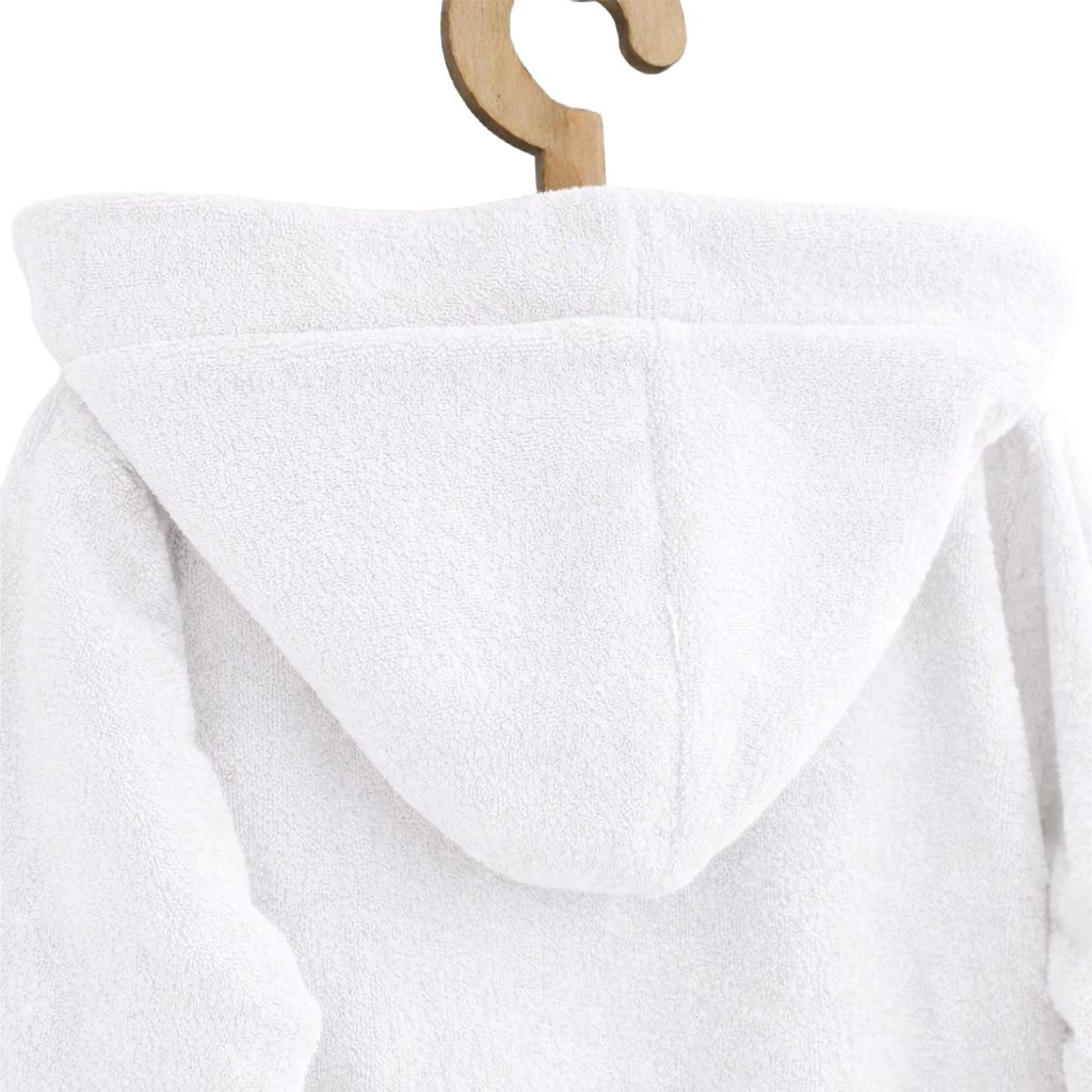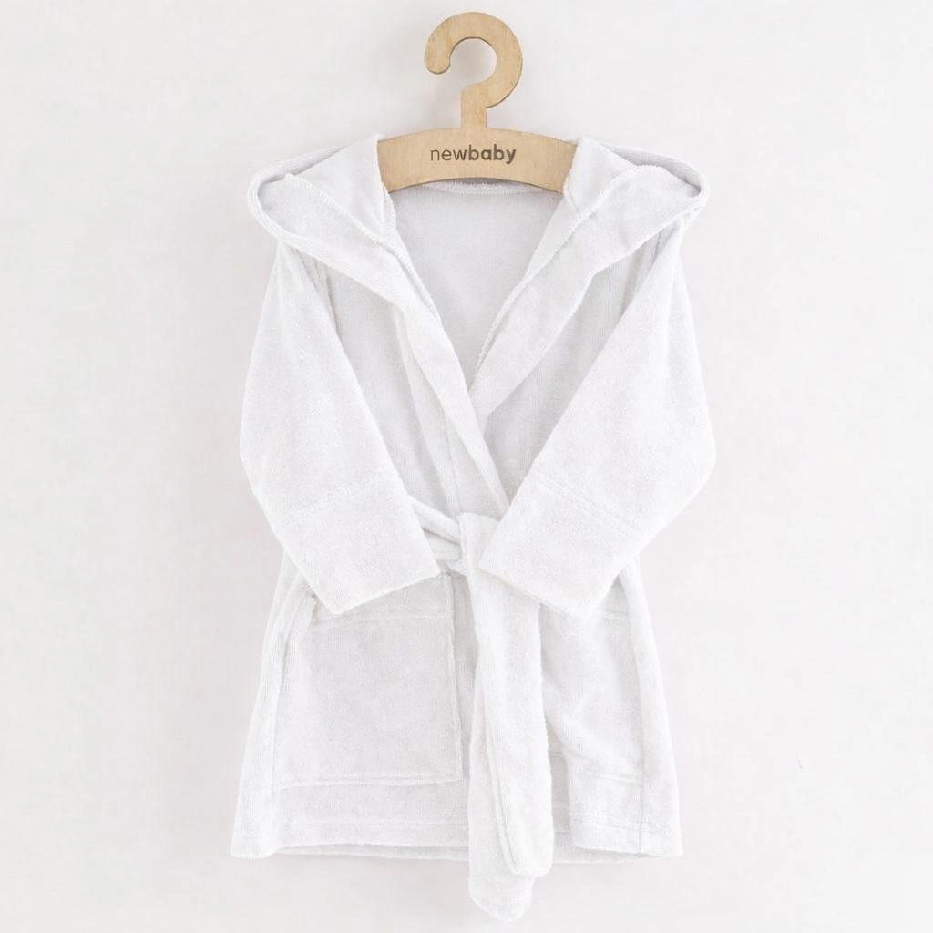 Bereiten Sie nach dem Baden Freude mit dem bequemen und wärmenden Bademantel NEW BABY aus Frottee-Baumwolle. Das weiche Material ist sanft zur Kinderhaut, nimmt Feuchtigkeit gut auf und wärmt schnell. Die praktische Kapuze schützt vor Kälte und hilft, die Haare zu trocknen.