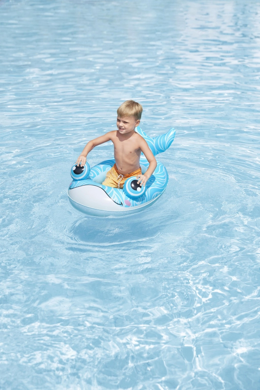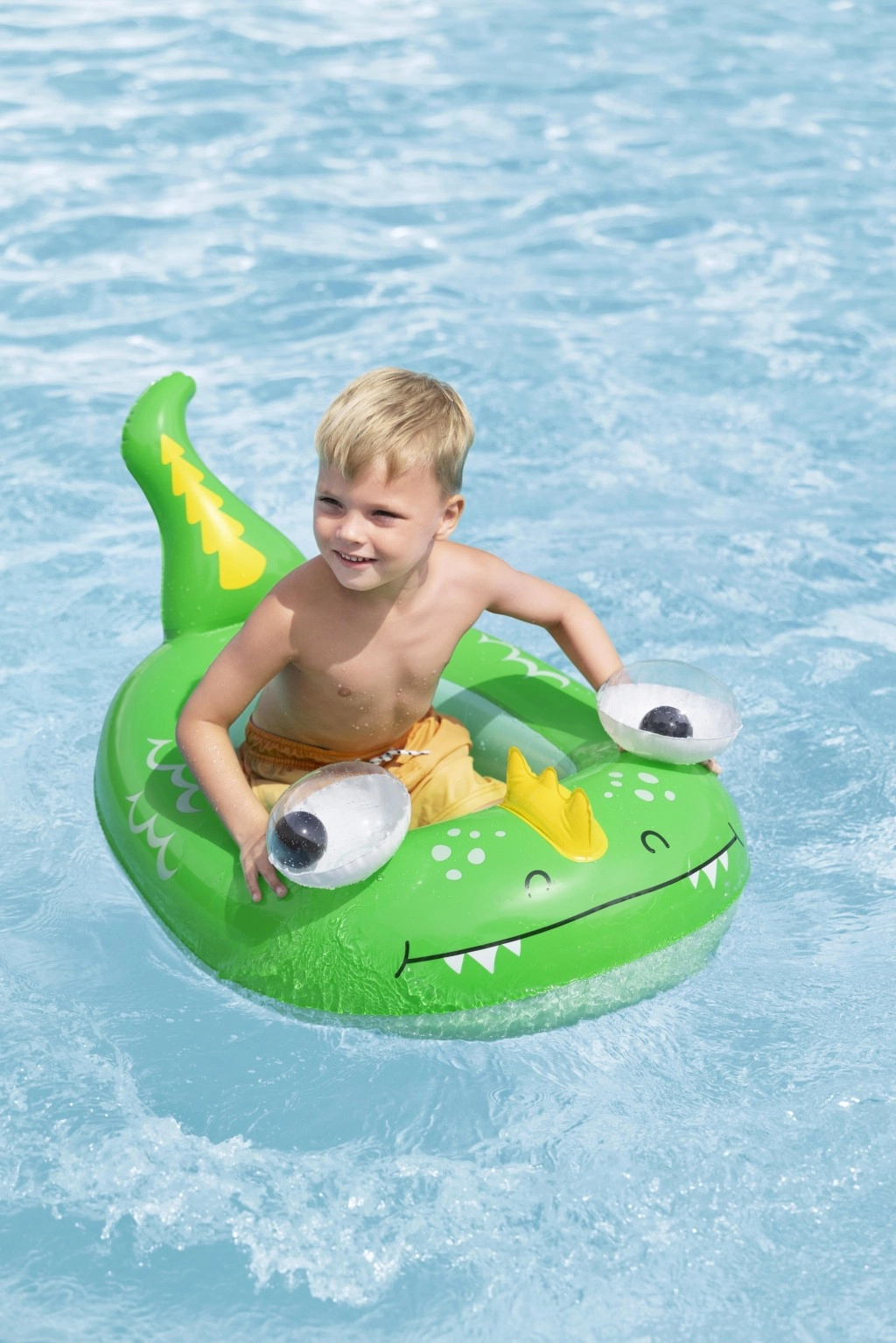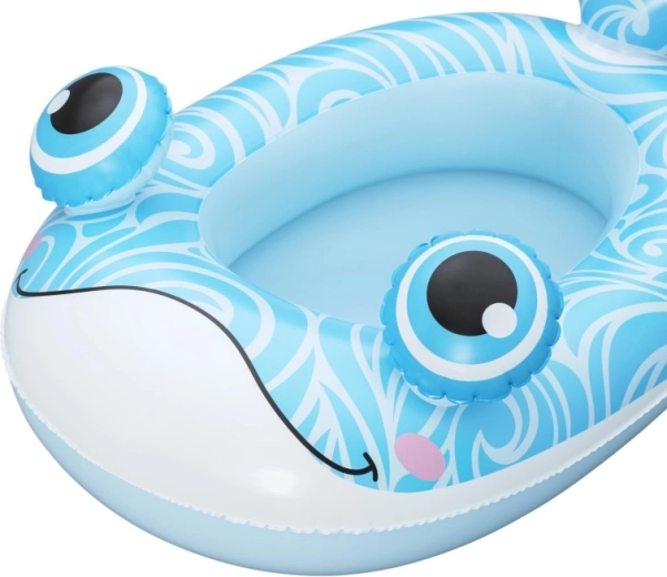 Jedes Motiv bietet eigene verspielte Details: ein blauer Wal mit weißen Spiralen und 3D‑Augen, ein grüner Drache mit ausdrucksstarken Augen und gelben Akzenten sowie ein gelb‑türkisfarbenes U‑Boot mit weißem Propeller für noch mehr Spaß. Sicherheitsventile ermöglichen schnelles Auf- und Ablassen der Luft – ideal für Familien unterwegs und fürs Wochenendbaden.