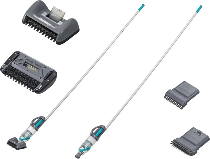 Im Lieferumfang sind zwei austauschbare Reinigungsaufsätze für verschiedene Oberflächen enthalten – vom flachen Boden bis zu Ecken und Stufen. Die modulare 2-m-Stange ermöglicht komfortable Reichweite ohne Bücken; nach dem Abnehmen wird der AquaGrip zu einem wendigen Handstaubsauger für Detailreinigung. Das LED-Licht sorgt für bessere Übersicht auch bei schlechteren Bedingungen.