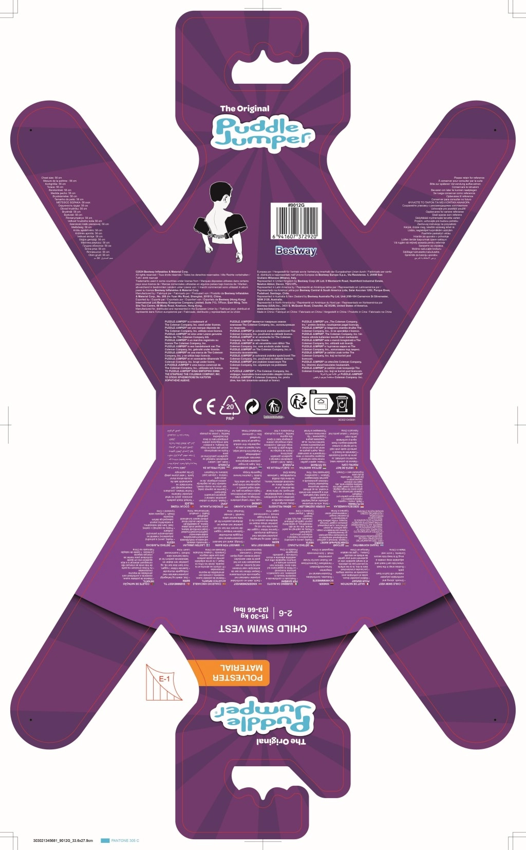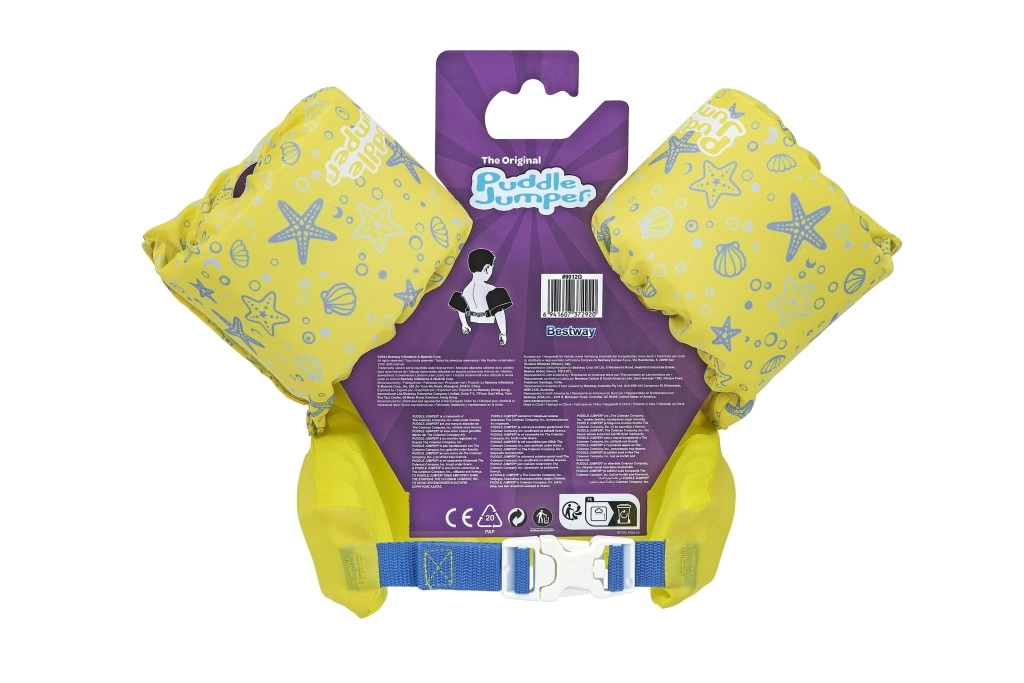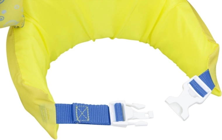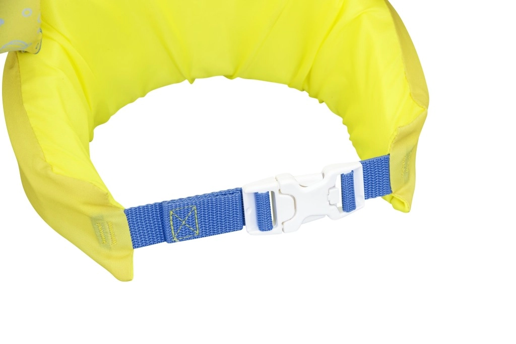 Die Ärmel umschließen die Arme fest und stabilisieren die Position des Kindes, während die rückseitige Schnalle mit verstellbarem Gurt einen sicheren, gegen Aufspringen geschützten Sitz gewährleistet. Die Weste ist leicht, einfach zu transportieren und widerstandsfähig gegen Wasser und Sonne – ideal für Urlaub, Gartenpool und Freibad.