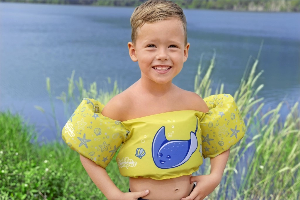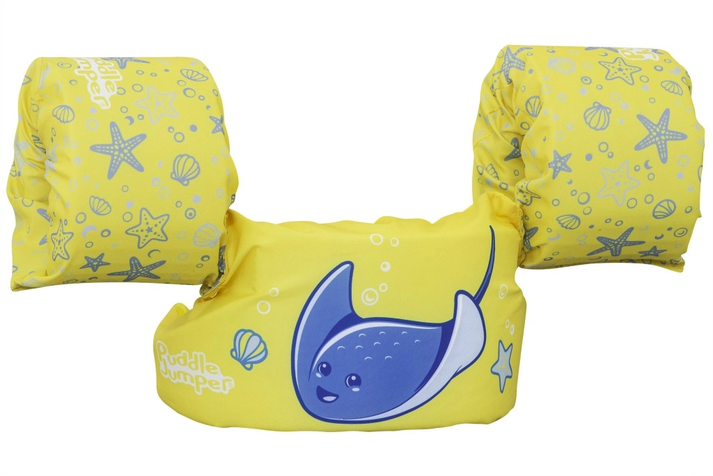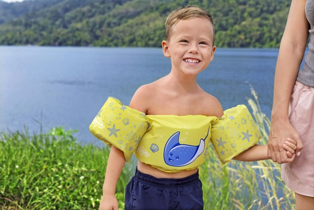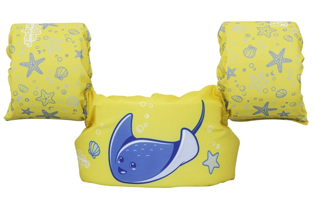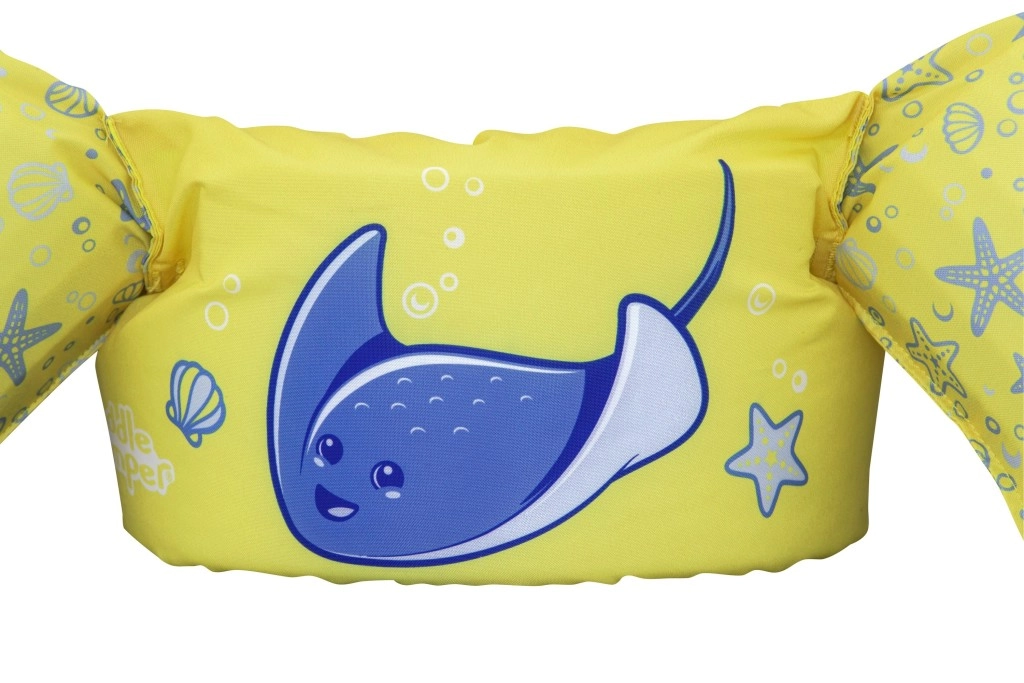 Diese Kinder-Schwimmweste mit integrierten Ärmeln kombiniert den Komfort von weichem Polyester mit sicherem Auftrieb dank hochwertiger Schaumeinlagen. Das leuchtend gelbe Design mit blauem Rochen und maritimen Motiven erhöht die Sichtbarkeit des Kindes im Wasser und lädt spielerisch zu Wasserspaß ein.