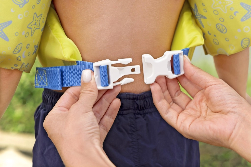 Der verstellbare blaue Gurt mit hochwertiger Kunststoffschnalle hält die Weste fest an Ort und Stelle und verhindert ein unbeabsichtigtes Öffnen durch das Kind.