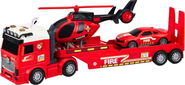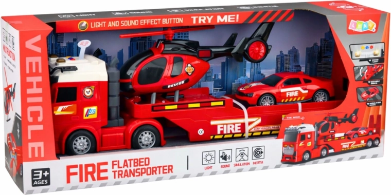 Dieses detailreich gestaltete Feuerwehr-Set in ikonischem Rot mit FIRE-Aufschriften bringt Kindern realistische Szenen von Rettungsoperationen. Der große Lkw mit Auflieger transportiert Hubschrauber und Auto direkt zum Einsatzort, wo dank Licht- und Soundeffekten die spannende Action beginnt.