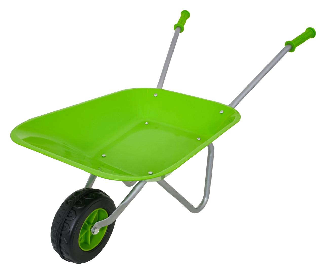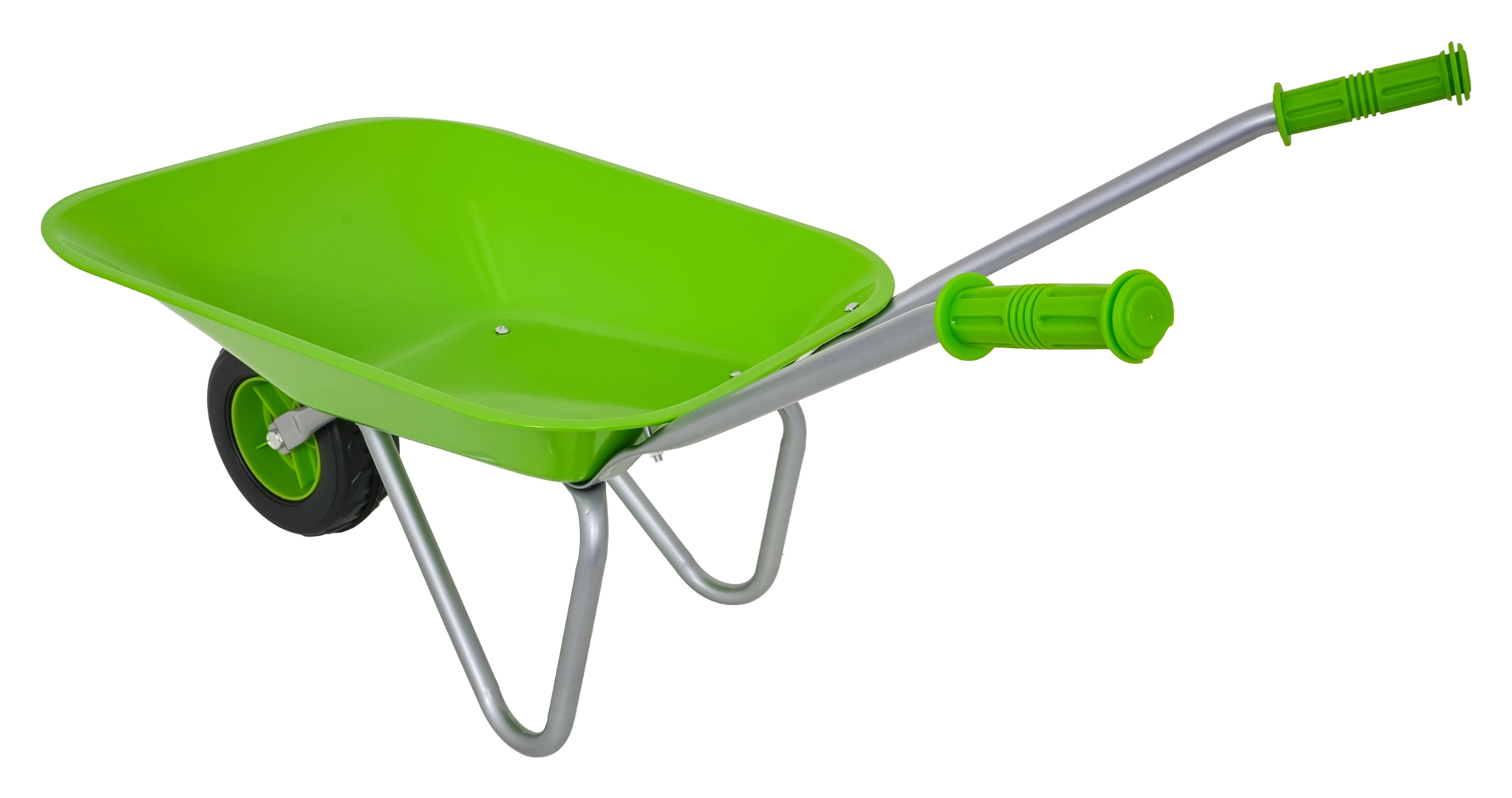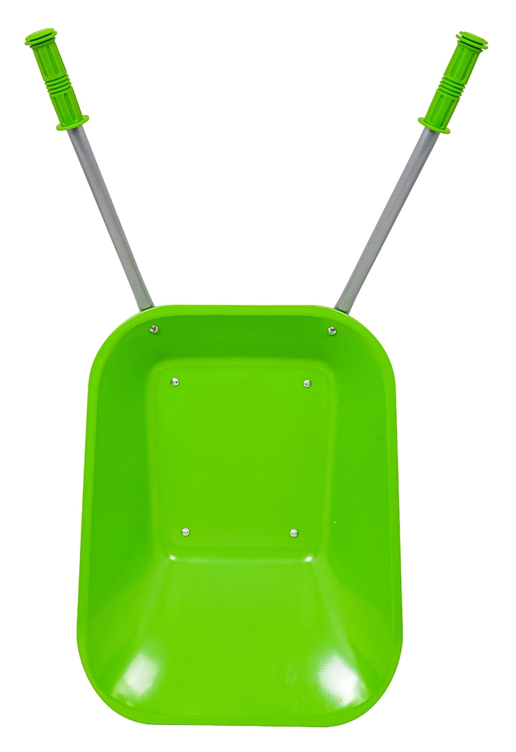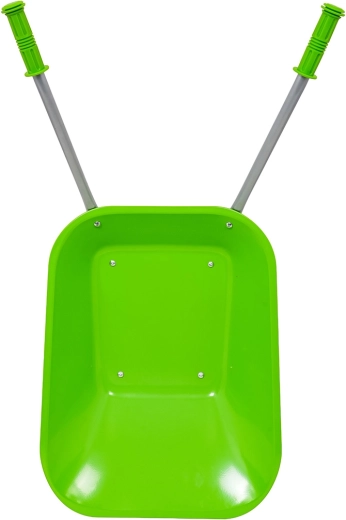 Leichte und stabile Kinderschubkarre mit breiter Mulde und einem Rad meistert Erde, Laub und kleines Werkzeug. Ergonomische Griffe mit rutschfesten Auflagen erleichtern die Handhabung.