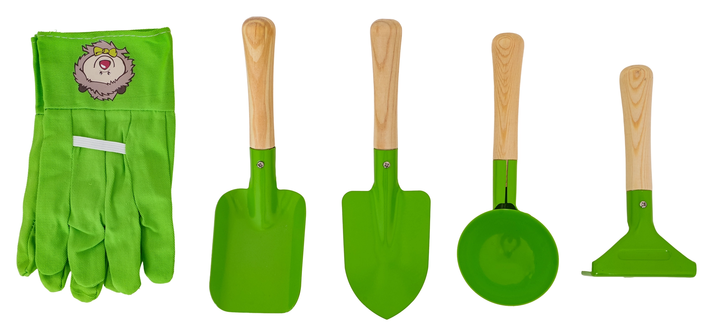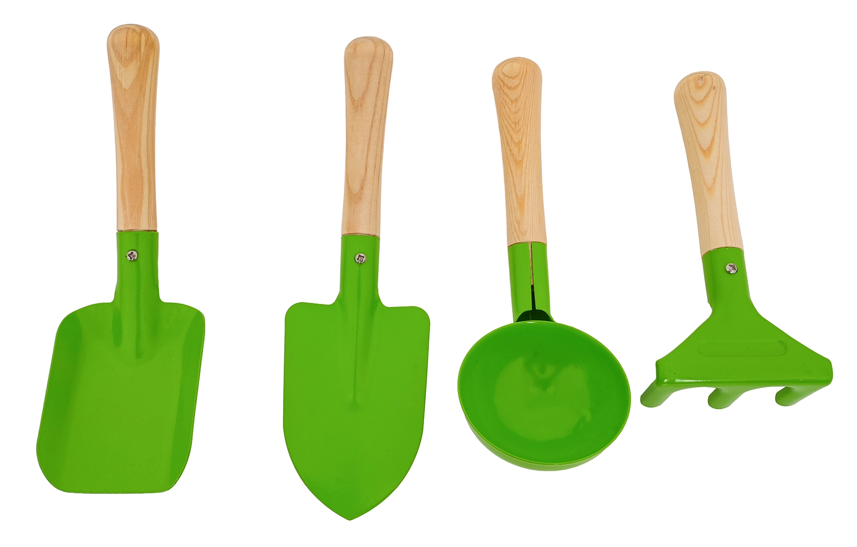 Das Set enthält eine Schaufel, einen spitzen Pflanzspaten, eine runde Sandschaufel und einen kleinen Rechen. Stabile Metallköpfe und glatte Holzgriffe sorgen für Komfort und lange Lebensdauer.
