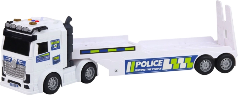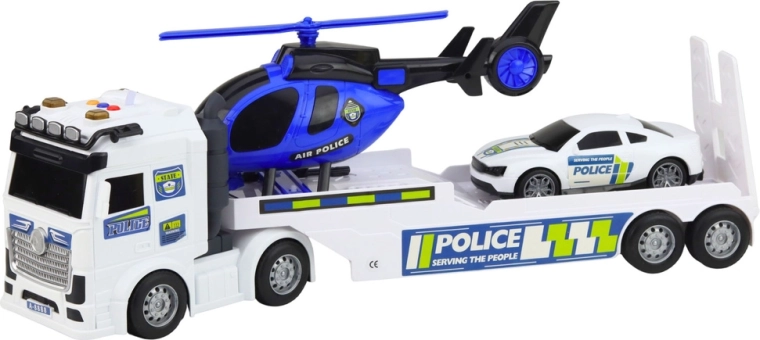 Die lange, niedrige Plattform mit Rampe befördert bequem sowohl das Polizeiauto als auch den Hubschrauber. Kinder können laden, entladen und verschiedene Transportszenarien planen.