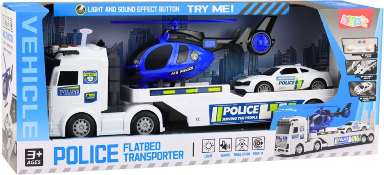 Das Set kombiniert drei beliebte Fahrzeuge zu einem dynamischen Paket. Der robuste Lkw mit Tieflader-Anhänger transportiert sowohl das Polizeiauto als auch den Hubschrauber, sodass Kinder Transporte, Einsätze und Patrouillen am Boden und in der Luft planen können. Integrierte Lichter und Sounds im Lkw verstärken das realistische Spielerlebnis.
