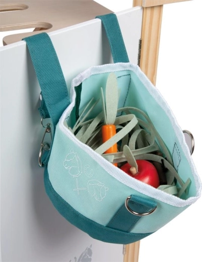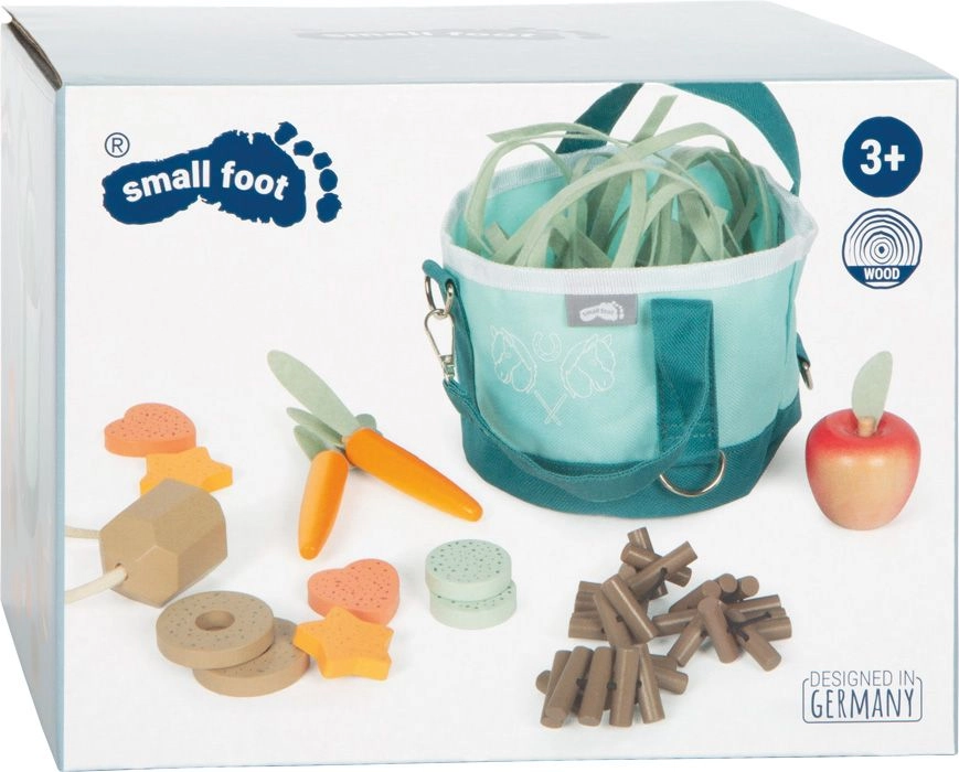 • Komplettes Spielset: Textileimer/Tasche, hölzerner Apfel, Karotten, „Kekse“, „Pellets“, „Heu“ und weiteres Zubehör.