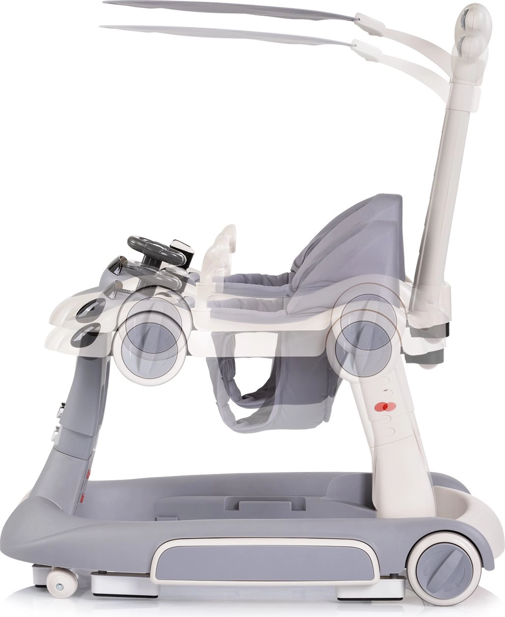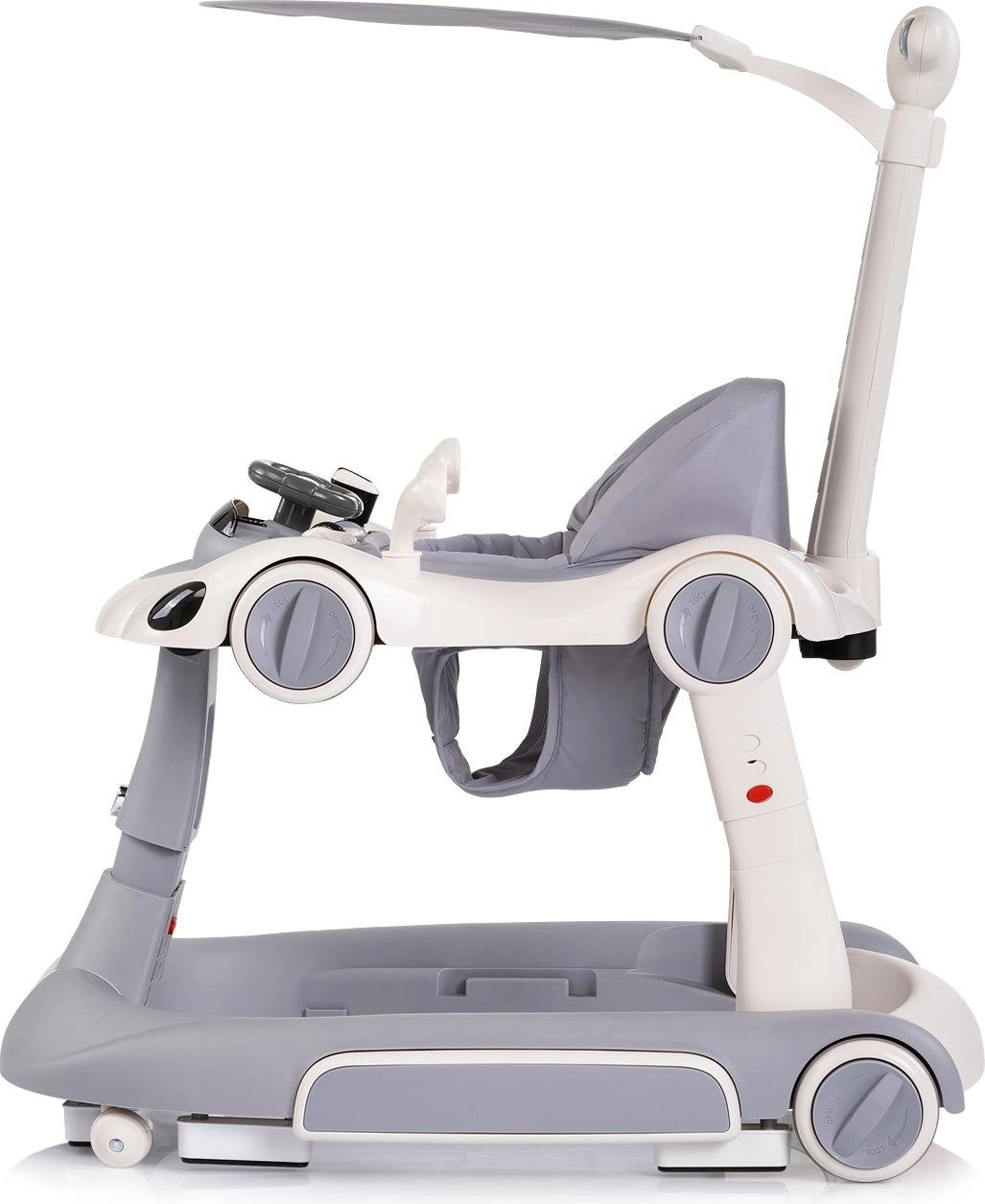 Eine Lösung für mehrere Entwicklungsphasen: stabiler Lauflernwagen, Wipp- und Hüpffunktion, Spielcenter sowie Fahrt mit Unterstützung der Eltern. Spart Platz und Budget.