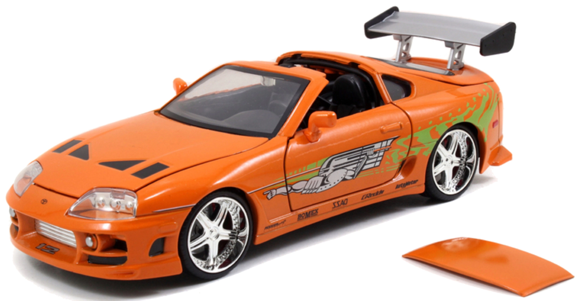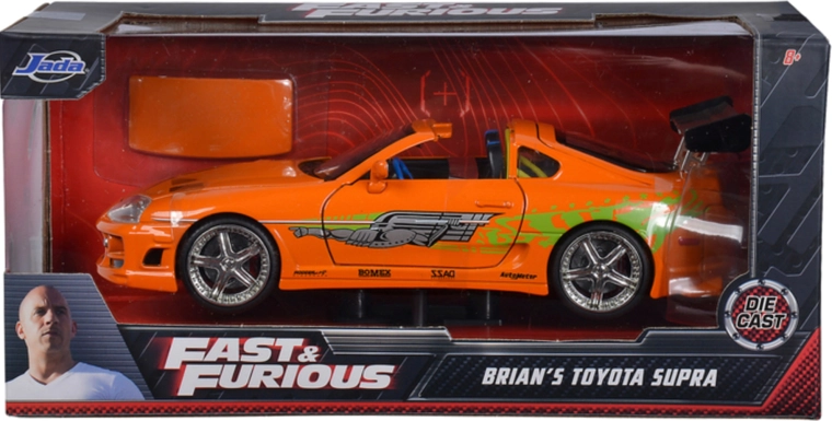 Erleben Sie den Adrenalinkick der Serie Fast & Furious mit der präzisen Replik der Toyota Supra von Jada Toys. Das Modell im Maßstab ca. 19 cm bietet eine Karosserie aus Metall, öffnende Türen und Kofferraumdeckel sowie eine detailreiche Ausführung in ikonischem Orange – perfekt für Sammler und Fans schneller Autos.