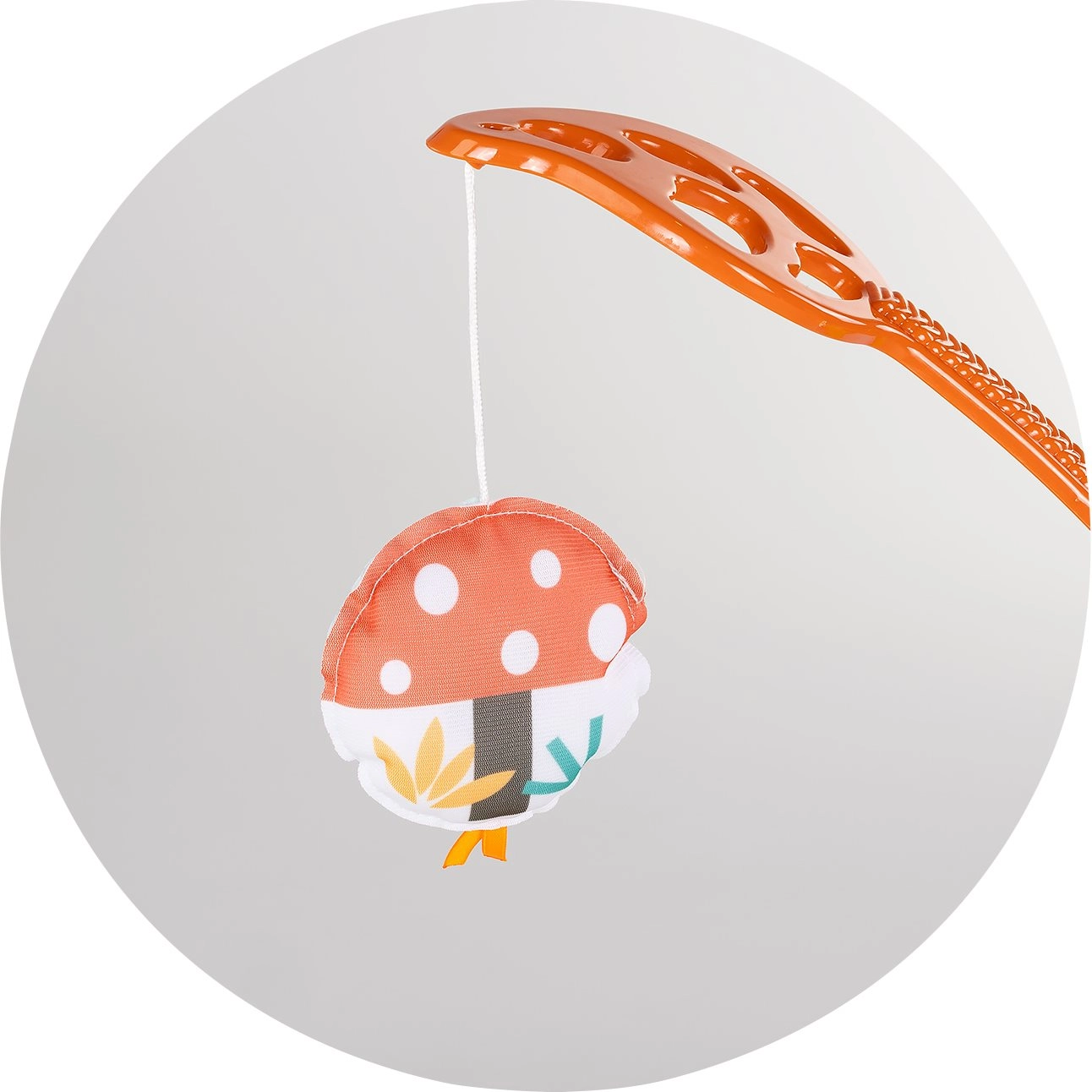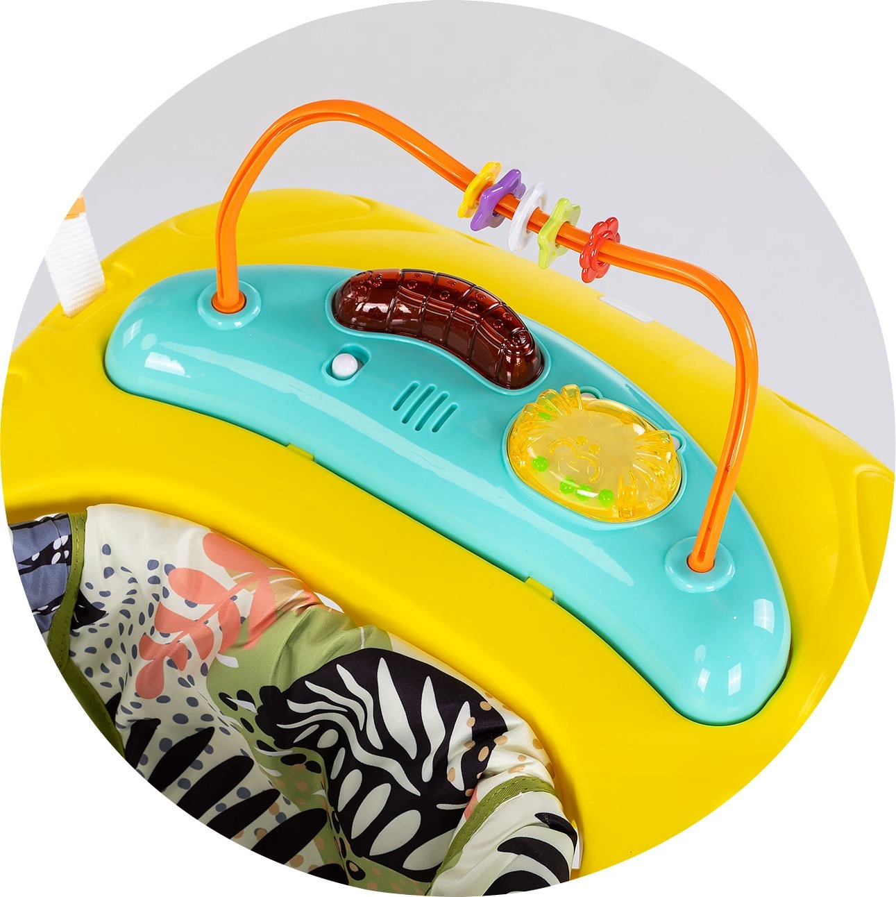 Hängende Spielzeuge und Aktivitäten fördern die Hand-Auge-Koordination, während der stabile Rahmen und die hochwertige Verarbeitung für sichere Bewegung sorgen. Die Lautstärke ist einstellbar, der Betrieb erfordert 2× AA-Batterien (nicht im Lieferumfang enthalten). Für eine gesunde Nutzung wird eine maximale Dauer von 20 Minuten pro Aktivität empfohlen.