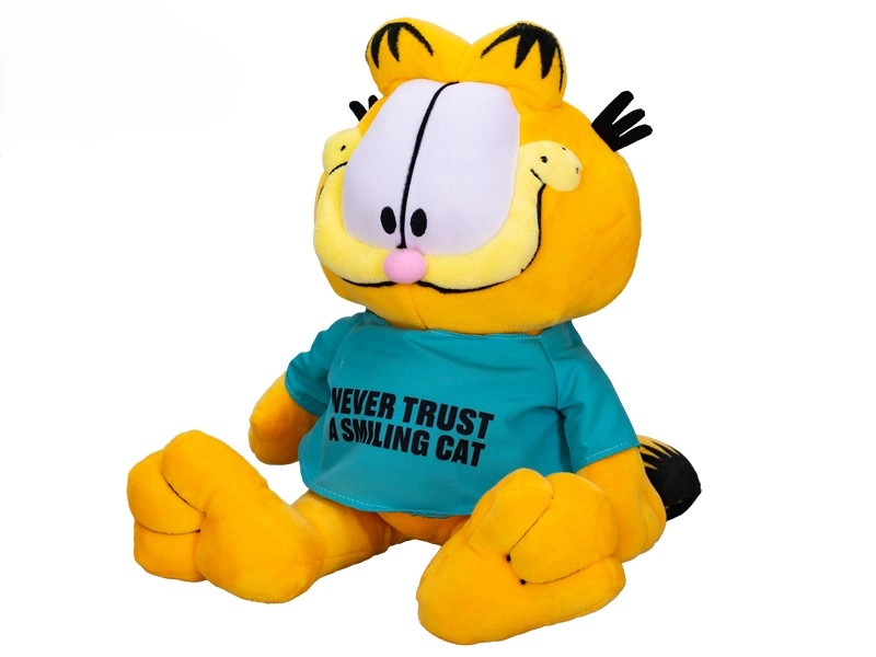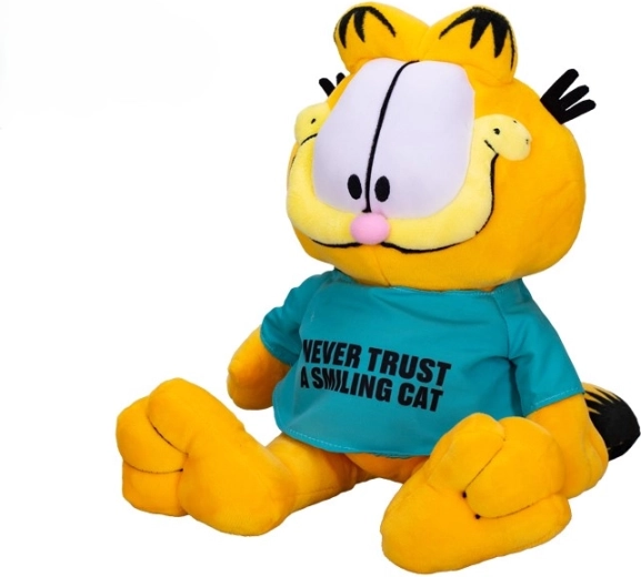 Begrüßen Sie in Ihrer Sammlung oder im Kinderzimmer den legendären Kater GARFIELD! Dieses hochwertig verarbeitete Plüschtier in sitzender Position ist aus zartem, kuschelweichem Plüsch gefertigt, der geradezu zum Schmusen einlädt. Das stylische T‑Shirt mit dem Aufdruck „Never trust a smiling cat“ verleiht der Figur Charakter und macht sie zu einem großartigen Geschenk für kleine und große Fans.