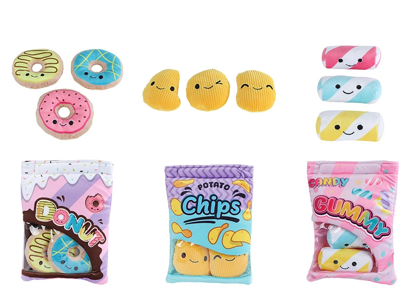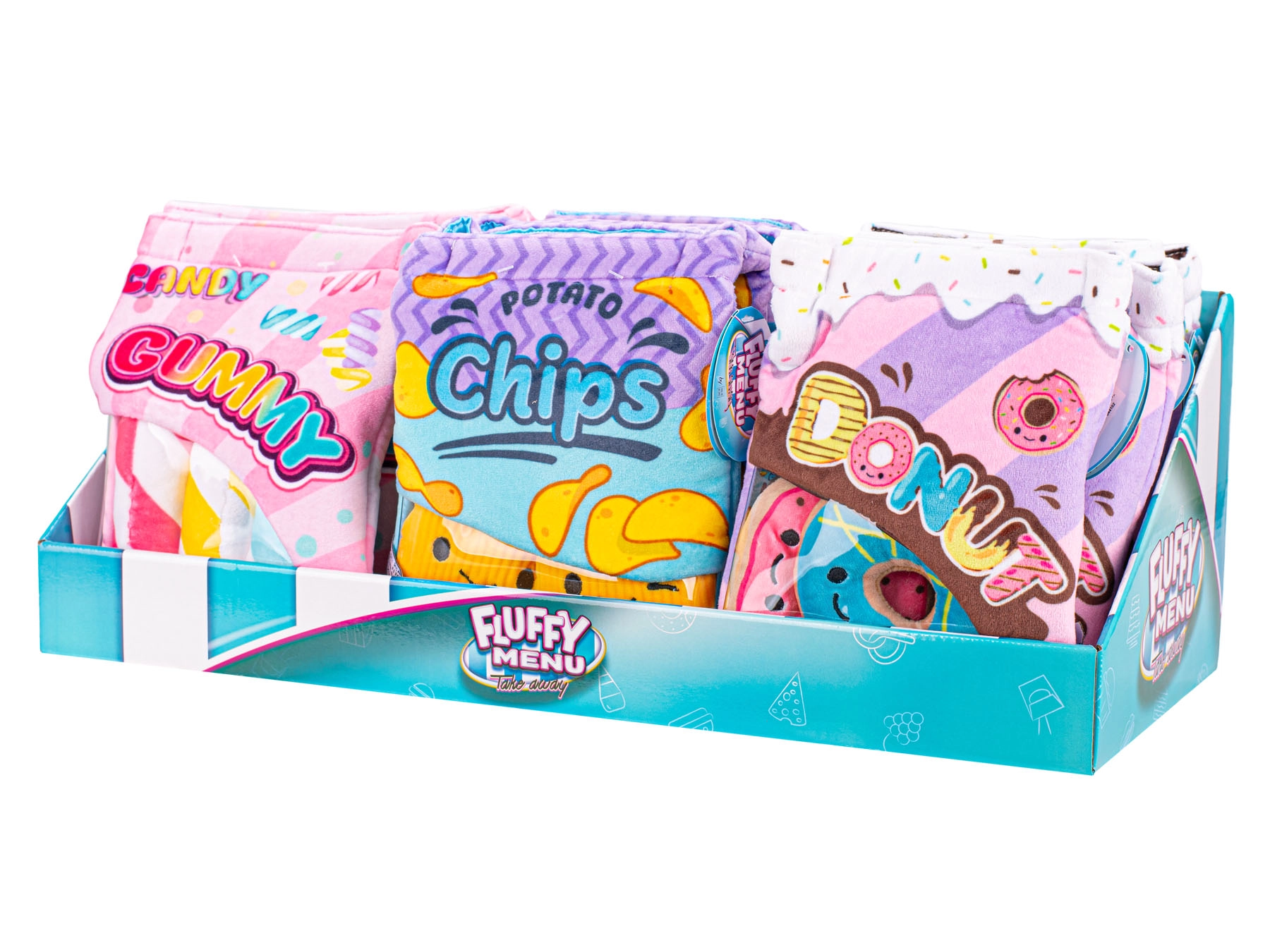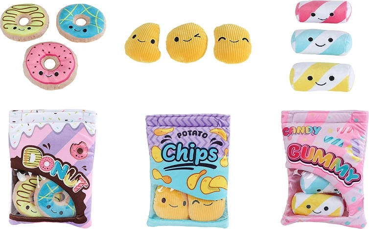 Im Inneren jedes Beutels befindet sich ein Plüsch-Snack – zur Auswahl stehen Chips, Donuts und Gummis. Mit den Abmessungen von ca. 16 × 8 × 6 cm liegt er gut in kleinen Händen und dank der Länge von 21 cm lässt er sich leicht transportieren. Er ist außerdem ein praktisches Geschenk für jeden Anlass.