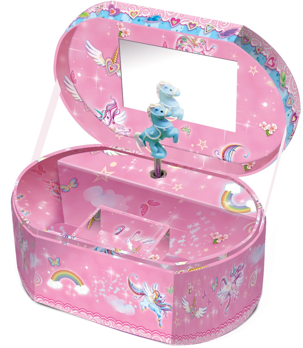 Das zauberhafte ovale Schmuckkästchen mit Einhornmotiv erfreut jede kleine Prinzessin. Beim Öffnen spielt es eine wunderschöne Melodie, bietet viel Platz für Ohrringe, Armbänder und kleine Schätze und wird zu einer hinreißenden Dekoration fürs Kinderzimmer.