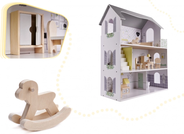 Holzpuppenhaus mit grauen Accessoires