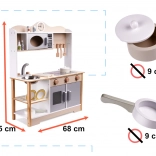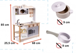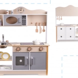 Lulilo Kuketo Holzspielküche für Kinder bietet endlose Möglichkeiten für Spaß und Entwicklung Ihres Kindes. Diese Küche verfügt über realistische Funktionen, darunter ein Spülbecken mit Wasserhahn, Herd, Mikrowelle und Stauraum in Form von Regalen und Schränken. Die Maße der Küche sind ideal für kleine Kinder, was einen einfachen Zugang zu allen Spielzeugelementen ermöglicht.