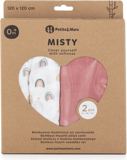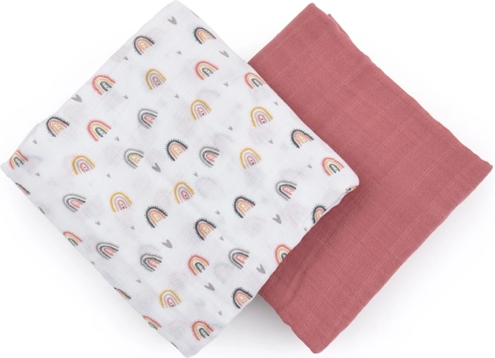 Das großzügige Maß 120 × 120 cm erleichtert das Pucken und erweitert die Einsatzmöglichkeiten zu Hause und unterwegs. Das Set enthält ein Tuch im zarten Farbton Misty Rose und eines mit fröhlichem Regenbogen- und Herzchen-Motiv – ein praktisches und stilvolles Accessoire für die Babyausstattung.