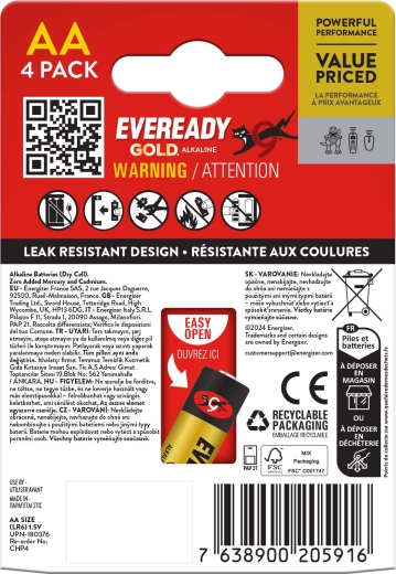 Zuverlässige alkalische AA-Batterien ENERGIZER Eveready Gold bieten lange Lebensdauer und stabile Leistung für den täglichen Einsatz in Fernbedienungen, Spielzeugen oder Taschenlampen. Im Vergleich zu herkömmlichen Zink-Kohle-Batterien halten sie bis zu 3× länger.
