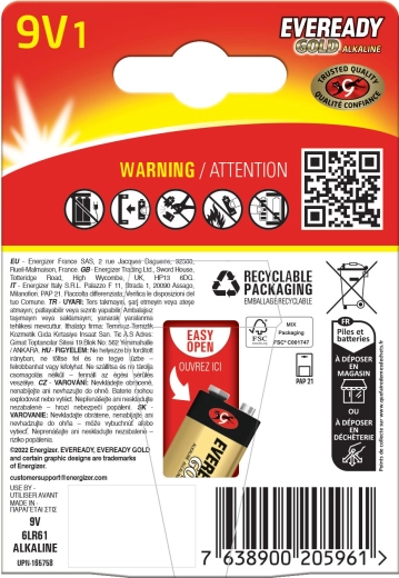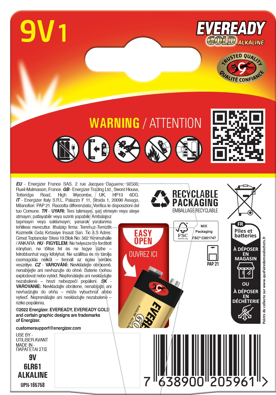 Die 9V-Alkalibatterie ENERGIZER EVEREADY GOLD wurde entwickelt, um gängige Haushaltsgeräte mit mittlerem Verbrauch zuverlässig mit Strom zu versorgen. Sie kombiniert eine stabile Spannung von 9 V, lange Haltbarkeit und erhöhten Auslaufschutz, sodass Ihre Geräte sorgenfrei funktionieren.
