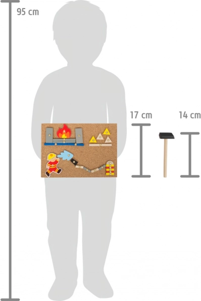 Dieses kreative Klopfspiel ist die ideale Wahl für Kinder, die gerne basteln und die Welt der Feuerwehr lieben. Dank des einfachen Systems mit vorgebohrten Löchern und dem sicheren Holzhammer gestalten Kinder mühelos eigene Motive auf der Korkplatte oder nutzen die beidseitigen Motivkarten als Vorlage.
