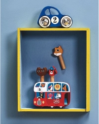 Das blaue Vilac-Auto besteht aus lackiertem Holz, was seine Langlebigkeit und gleichzeitig sein elegantes Erscheinungsbild gewährleistet. Es hat gummibeschichtete Metallräder, die eine ruhige und leise Fahrt garantieren. Dank seines speziellen Achsensystems kann das Auto nach links und rechts lenken, was dem Spiel Dynamik verleiht.