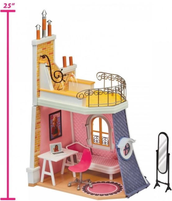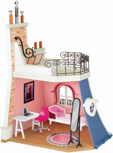 Das Haus verfügt über eine Terrasse im zweiten Stock, dekoriert mit rosa Wänden und Geländern, was dem Spiel eine zusätzliche Dimension verleiht.