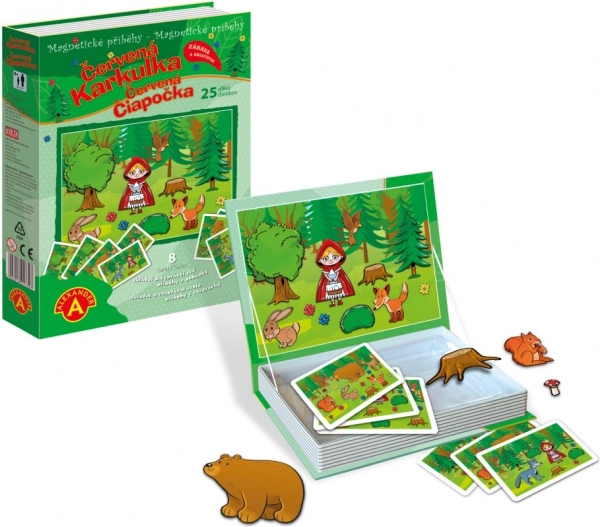 Entdecke die unterhaltsame Welt der magnetischen Geschichten zum Thema Rotkäppchen. Kinder legen Bildmagnete auf den magnetischen Hintergrund nach Vorlagen auf Karten oder erfinden eigene Kombinationen und Geschichten. Das Spiel funktioniert auch wie ein kleines magnetisches Theater, das ganz natürlich Fantasie und Kommunikationsfähigkeiten fördert.