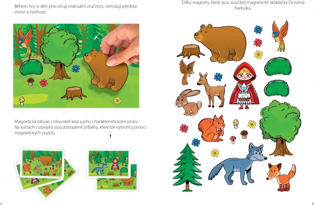 Die magnetischen Teile haften leicht an der Tafel, sodass alles an seinem Platz bleibt – auch unterwegs. Im Set enthalten sind Vorlagenkarten mit Geschichten sowie eine Anleitung auf Tschechisch und Slowakisch, damit Kinder allein, mit Eltern oder Lehrkräften spielen können.