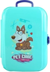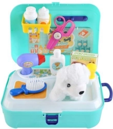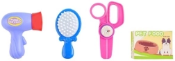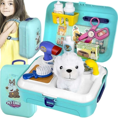 Zum Set gehören Werkzeuge wie Bürste, Föhn, Futterbox, Shampoo und Medikamente, was kreatives Spielen für Kinder ermöglicht.