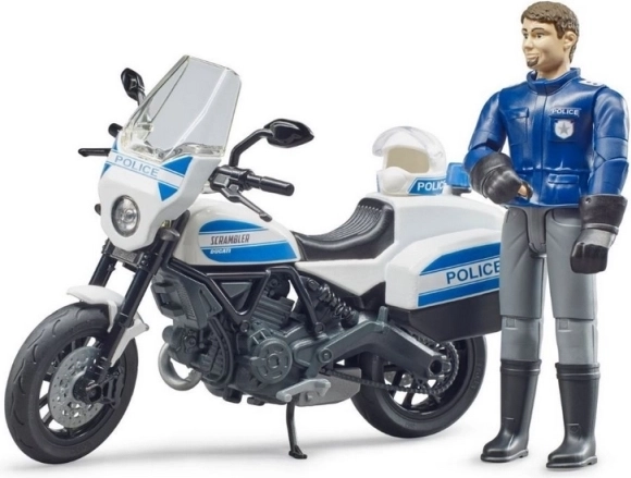 Das Polizeimotorrad DUCATI Scrambler von Bruder ist ein detailgetreues Modell für kleine und große Fans der Rettungsdienste. Das Motorrad hat drehbare Lenkung für einfaches Manövrieren und einen klappbaren Ständer für sicheren Stand. Die Polizistenfigur besitzt bewegliche Gliedmaßen, sodass sie in Fahrposition gesetzt oder neben dem Fahrzeug aufgestellt werden kann.