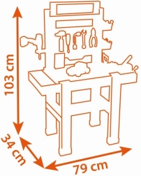 Die große Kinder-Werkbank BLACK+DECKER Bricolo Center von Smoby bietet eine realistische Werkstatt mit 92 Zubehörteilen. Enthalten sind eine mechanische Bohrmaschine, ein Schraubstock, Schraubendreher, Hammer, Säge, Zange sowie ein zusammenbaubares Auto. Die stabile Konstruktion, praktische Aufbewahrungsmöglichkeiten und die Maße 103 × 79 × 34 cm fördern die Motorik und Kreativität von Kindern ab 3 Jahren.