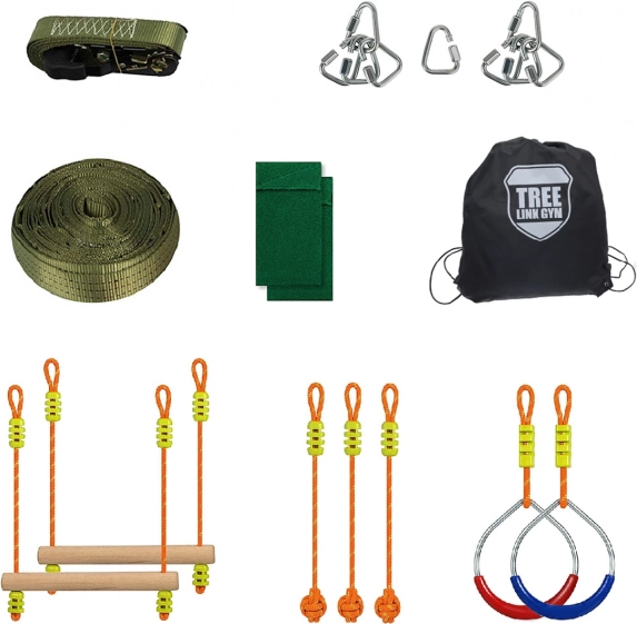 Der Ninja-Hindernisparcours 2Kids Toys basiert auf einem robusten Nylonband, das mithilfe einer stabilen Metallratsche zwischen zwei Bäumen gespannt werden kann. An dem Band lassen sich verschiedene Hindernisse mittels Karabinern befestigen. Diese Variabilität ermöglicht unterschiedliche Schwierigkeitsstufen und sorgt für ein unterhaltsames Training für alle. Darüber hinaus kann der Parcours auch als Slackline genutzt werden.