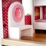 Das Puppenhaus ist mit drei Ebenen, die durch weiße Treppen verbunden sind, fünf Zimmern und einem Balkon ausgestattet, ideal für das Spiel mit der ganzen Puppenfamilie.