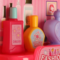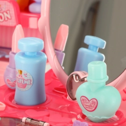 Enthalten sind Kämme, Spiegel, Fläschchen, Haar-Accessoires und weitere Requisiten für realitätsnahes Friseur- und Kosmetikspiel.