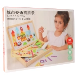 Die Tafel hat zwei Arbeitsflächen: eine weiße, magnetische zum Legen von Bildern aus Magnetteilen und zum Schreiben mit Trockenmarker, und eine schwarze Kreideseite zum Zeichnen mit Kreide. Das Thema „Stadt“ regt Rollenspiele an und unterstützt das Lernen von Farben, Formen sowie Grundlagen der Raumplanung.