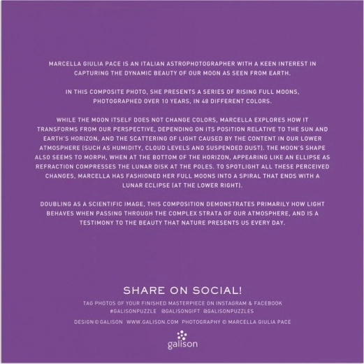 Das Motiv entstand aus Astrofotografien von Marcella Julia Pace, die an verschiedenen Orten in Italien über zehn Jahre hinweg aufgenommen wurden. Jede Aufnahme zeigt, wie sich die Farben des Vollmonds verändern – von Rot und Gelb am Horizont bis hin zu seltenen Blautönen, verursacht durch Staubpartikel in der Atmosphäre.