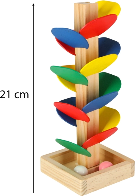 Kinder lassen die Kugel von der Spitze los, und sie dreht sich über die einzelnen bunten „Blätter“ und gleitet bis zur Basis. Jeder Aufprall erzeugt einen angenehmen Klang und motiviert zu weiteren Versuchen. Das Spiel fördert auf natürliche Weise die Feinmotorik, die Hand–Auge-Koordination, Geduld sowie das Farbempfinden und das Verständnis von Ursache–Wirkung.
