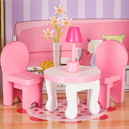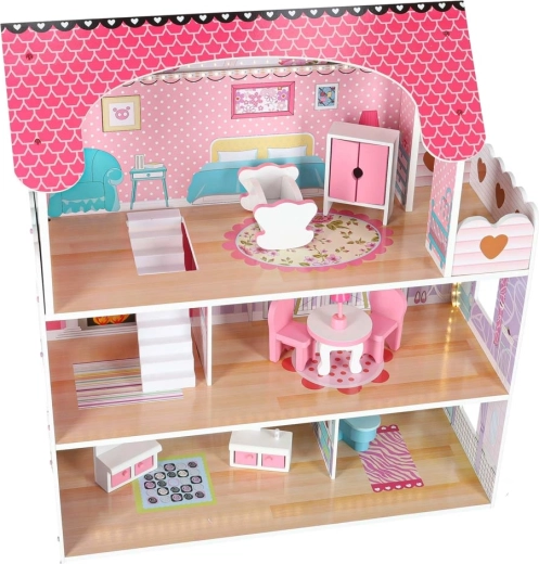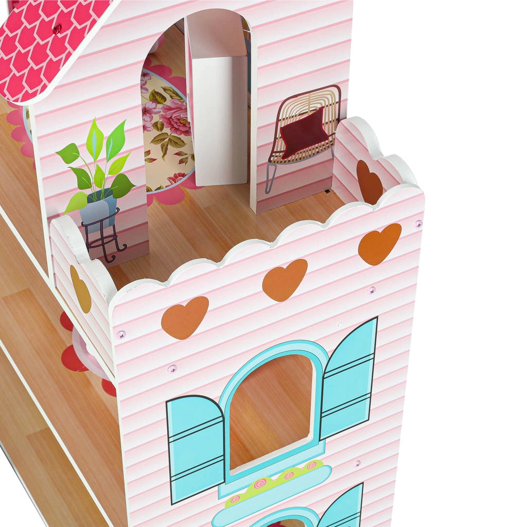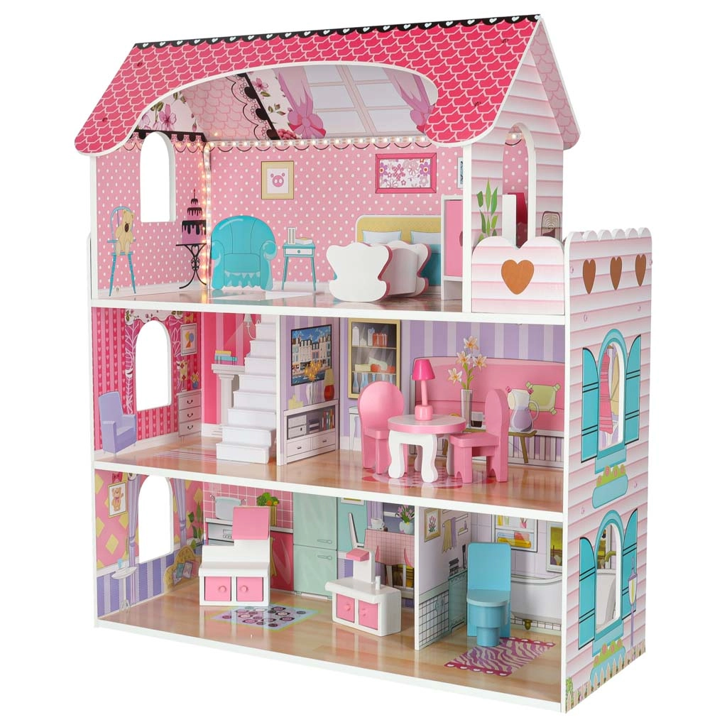 Inklusive LED-Beleuchtung auf einem selbstklebenden Streifen – lässt sich leicht an Decken oder Wänden anbringen und schafft eine behagliche Atmosphäre. Alle Elemente sind glatt verarbeitet für sicheres Spielen. Zugleich ist das Puppenhaus eine wunderschöne Dekoration fürs Kinderzimmer.