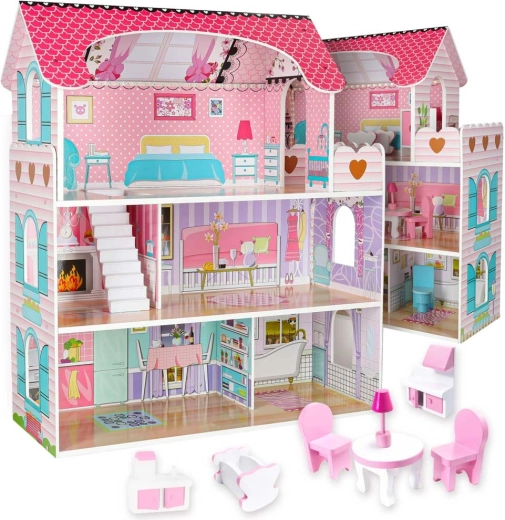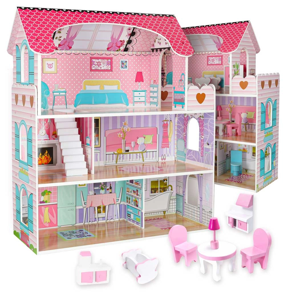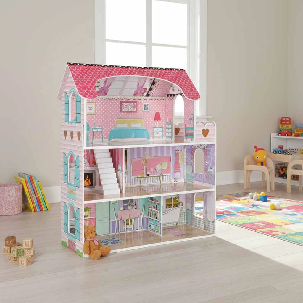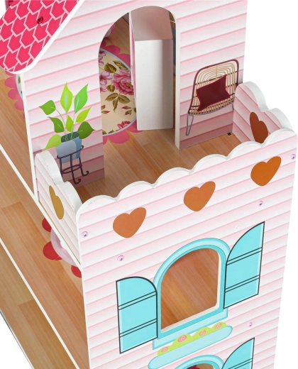 Das große Holzpuppenhaus erfreut Kinder und Eltern gleichermaßen. Drei geräumige Etagen beherbergen Küche, Bad, Schlafzimmer, Wohnzimmer und ein Treppenhaus mit Balkon. Das umfangreiche Set an Holzzubehör und realistische Wanddrucke fördern kreatives Rollenspiel und die Entwicklung der Feinmotorik.