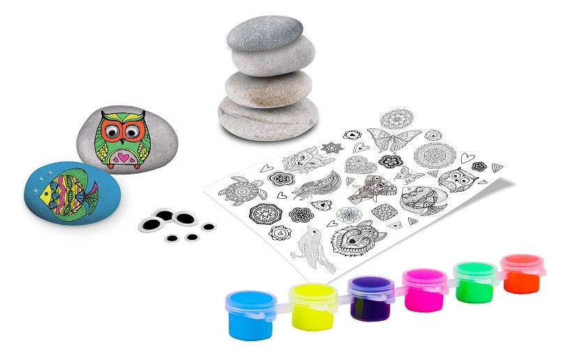 4 Steine, 6 Neonfarben, 1 Pinsel, 1 Holzstab, 1 Bogen Transferaufkleber, Beutel mit Klebeaugen und Perlen