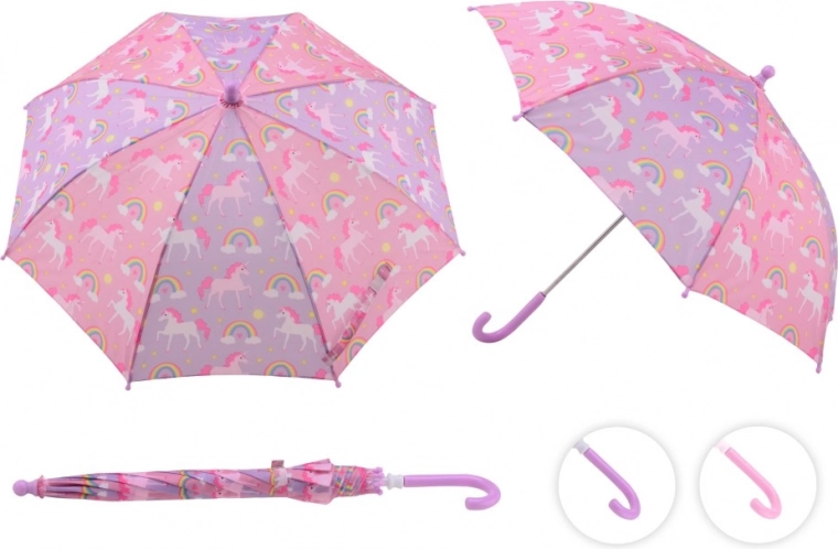Dieser Regenbogen-Regenschirm mit Einhorn-Design ist ein bezauberndes Accessoire für Kinder. Mit seiner bunten Oberfläche und der wahlweise rosafarbenen oder lilafarbenen Griff bringt er Farbe in regnerische Tage.