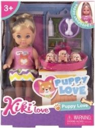 - Inhalt des Pakets: Puppe Kiki, 3 Welpen, Hundebett, Futterschüssel, Flasche.