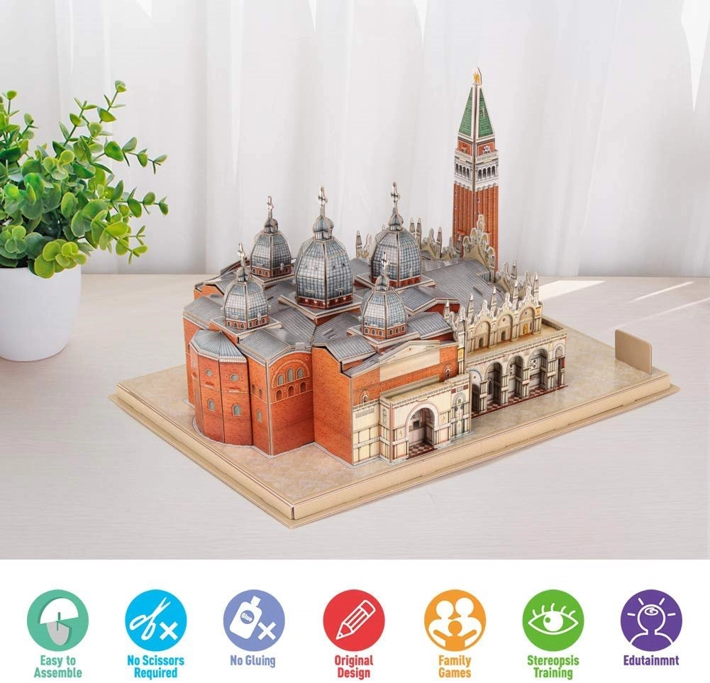 Bauen Sie den ikonischen venezianischen Platz mit dem 3D-Puzzle CUBICFUN aus der Serie National Geographic nach. Teile aus stabilem Schaum mit laminiertem Aufdruck greifen präzise ineinander, der Zusammenbau erfolgt ohne Klebstoff und Schere. Das Modell mit 107 Teilen bietet 120–220 Minuten Bauspaß und eignet sich hervorragend als stilvolle Dekoration für Wohnung oder Kinderzimmer.