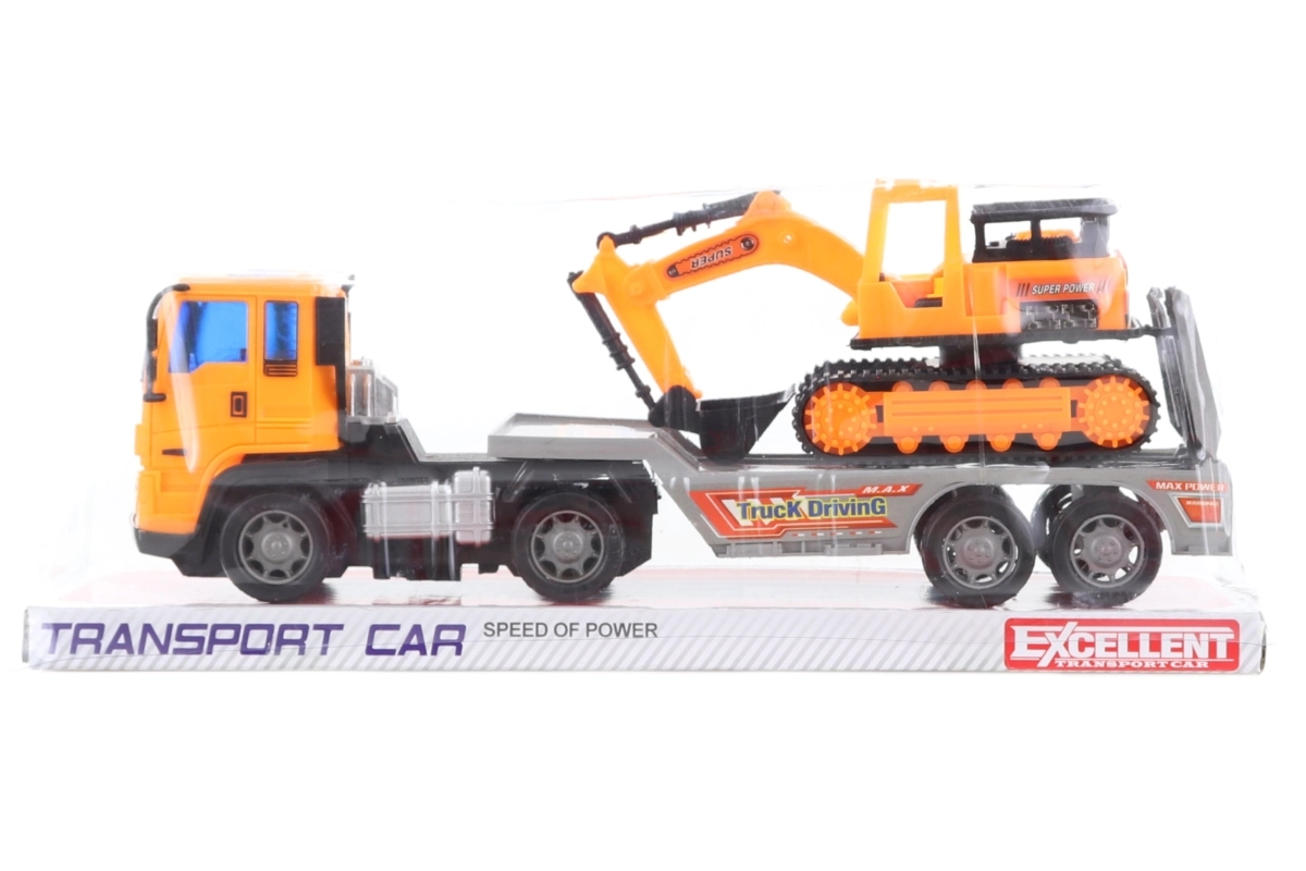 Plastiklastwagen mit Bagger, ca. 28 × 10,5 × 8 cm. Verpackungsgröße ca. 32 × 13 × 9 cm. Alter 3+.