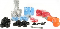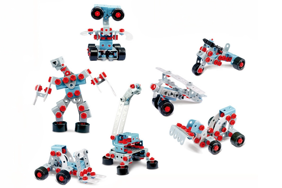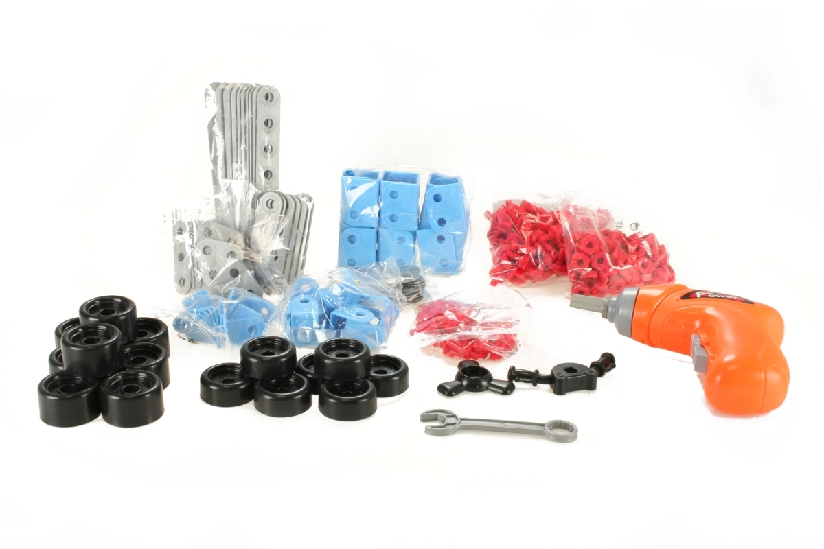 Modulare Träger, Verbinder, Räder und Schrauben ermöglichen wiederholte Umbauten. Ideal zur Förderung der Feinmotorik und des technischen Denkens.