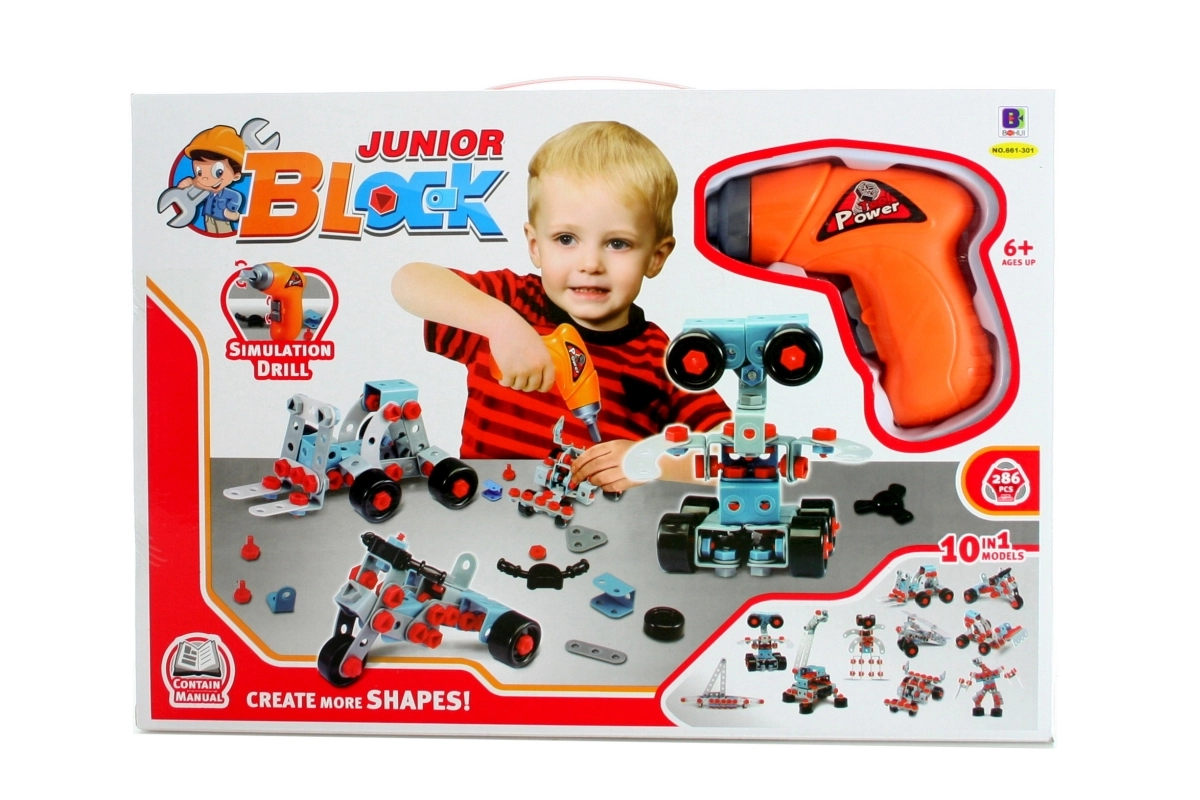 Der Junior Block Baukasten ist die ideale Wahl für kleine Konstrukteure, die Verschrauben und Entdecken lieben. Dank des umfangreichen Sets mit 286 robusten Kunststoffteilen, Rädern und Verbindern können Kinder vielfältige 10-in-1 Modelle zusammensetzen – von Fahrzeugen über Roboter bis hin zu originellen Eigenkreationen nach der eigenen Fantasie.